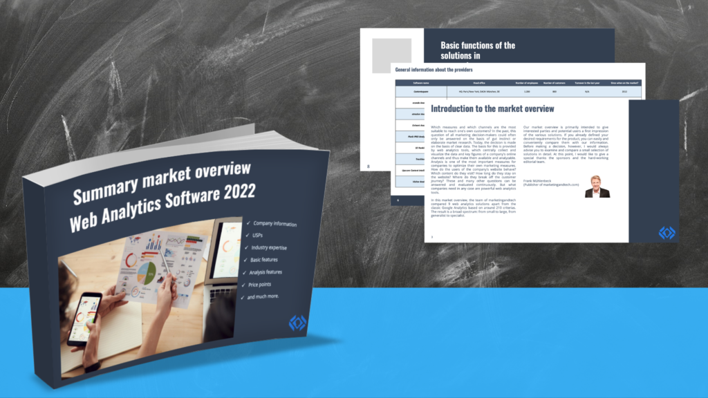 Web analytics help companies to constantly optimize their website and online marketing with regard to users. There are also numerous free solutions. However, their functions are by no means sufficient for every purpose. We have compared nine web analytics tools providers apart from Google Analytics on the basis of 211 criteria. In our web analytics tools comparison, you will get detailed insights into the respective tools. This article summarizes the most important aspects and, in addition to downloading the market overview, already provides you with a brief overview of the providers surveyed.